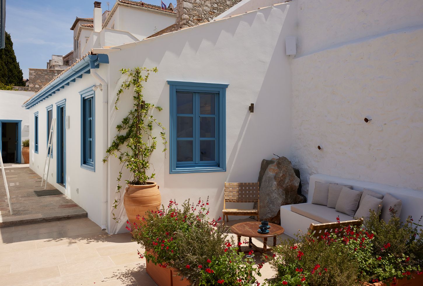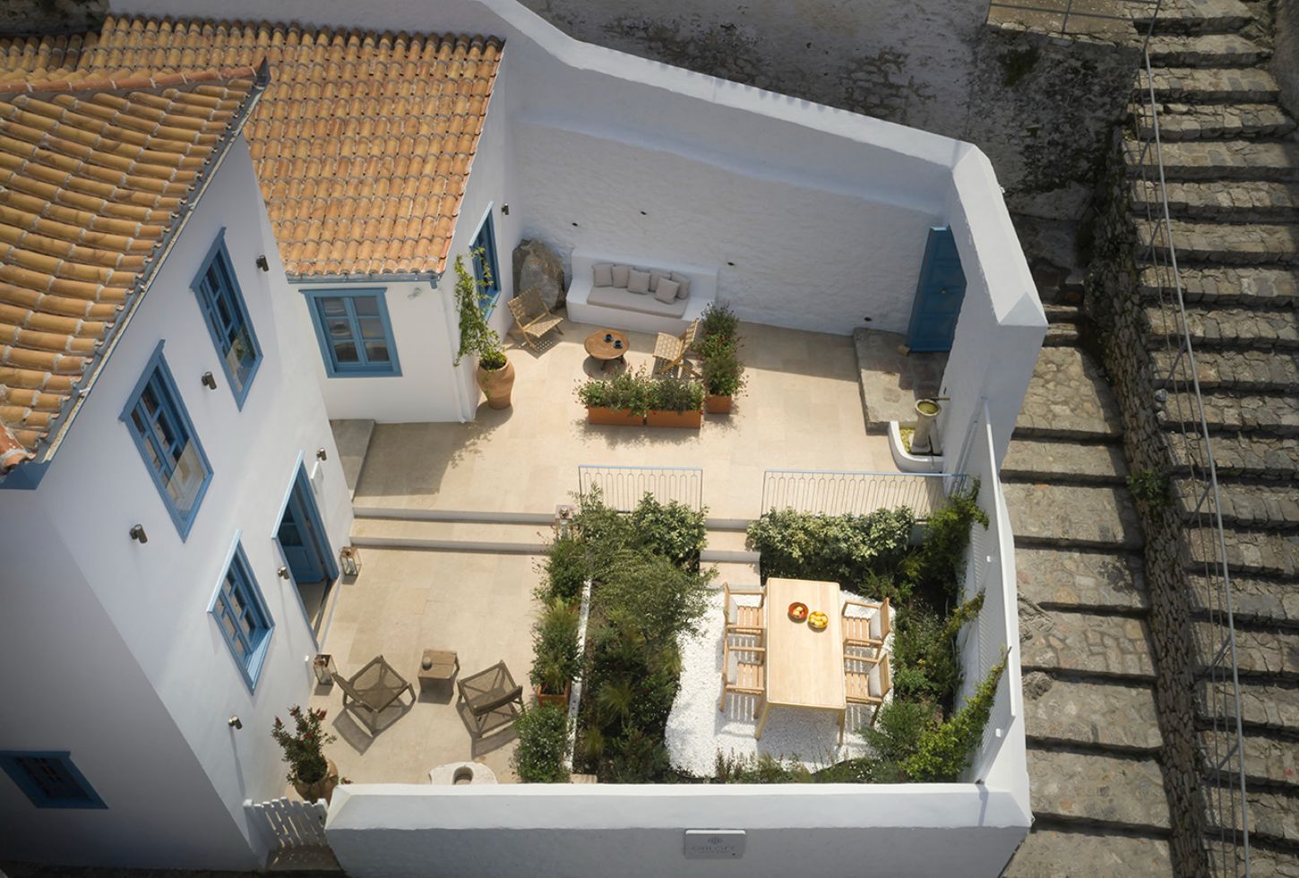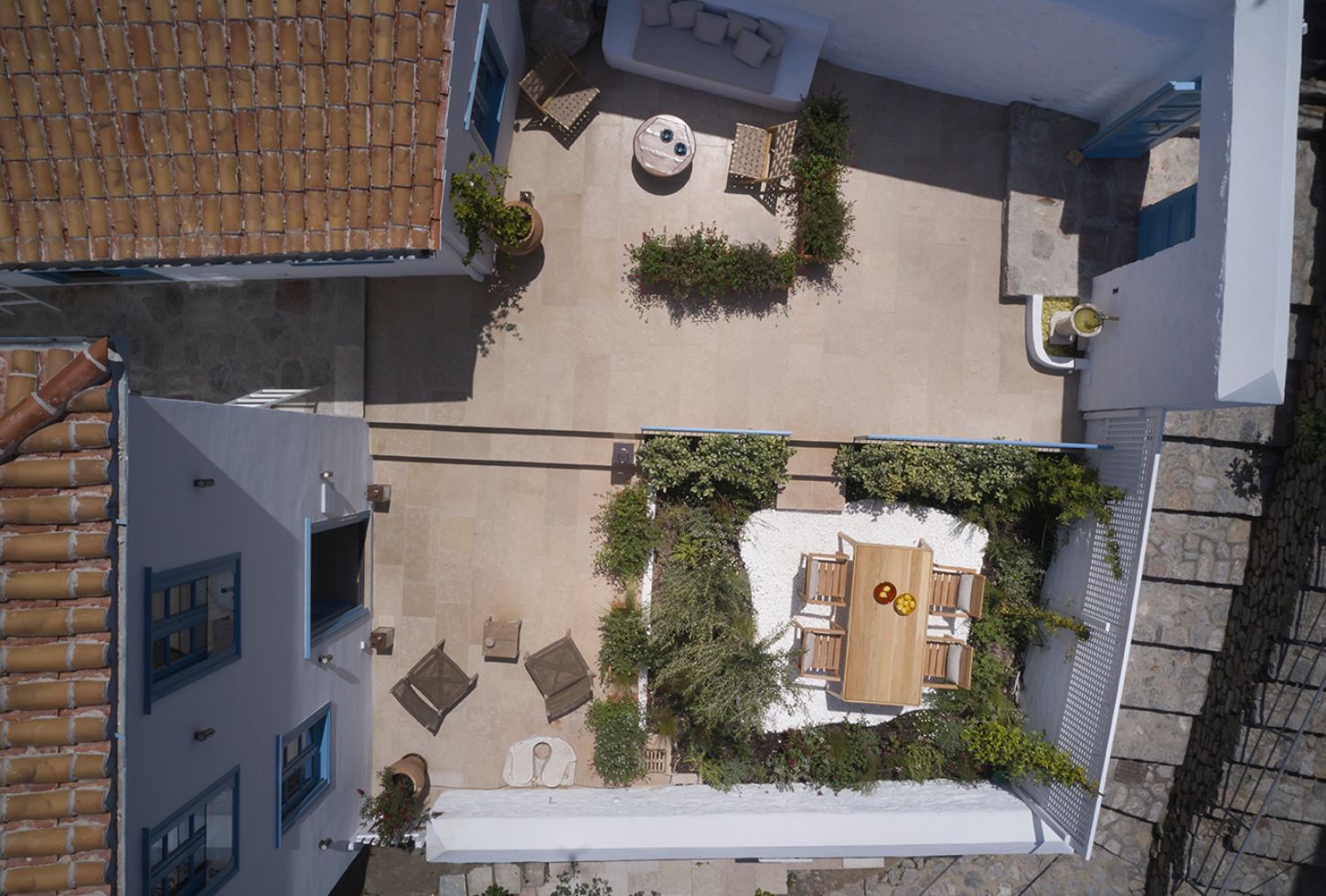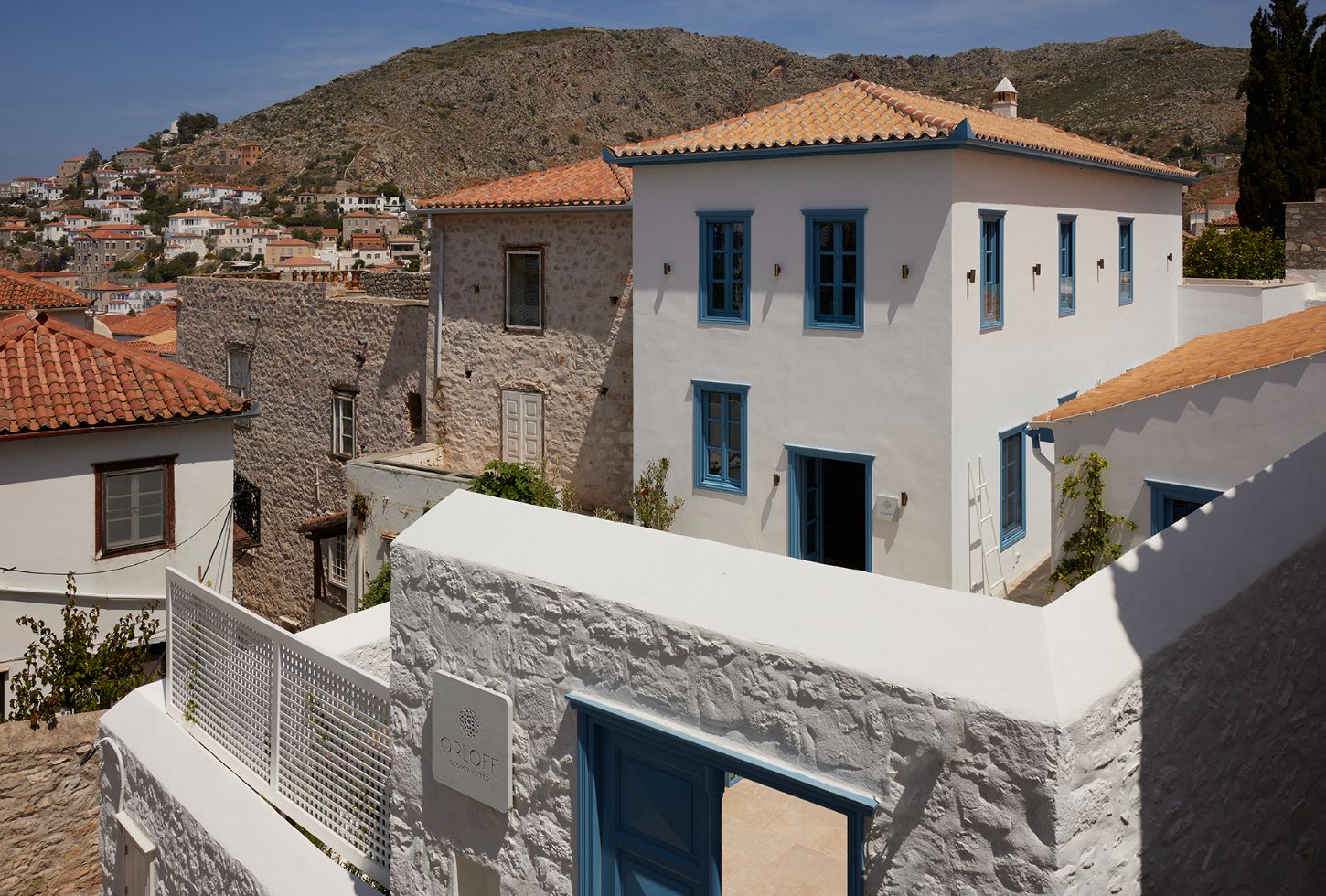 Rehabilitation has been made in full respect to historical Hydra standards, under the authority of the Byzantine archeology commission. The selection of noble materials such as Venetian stones, red Eretria marble, oak wood for the building, the respect of the Orloff color pallet especially on the blue windows, the use of fine fabrics enhancing the life on a Greek island, create a refined environment devoted to the well-being of the guest, while paying tribute to the unique character of Hydra, an island marked by history and authenticity.