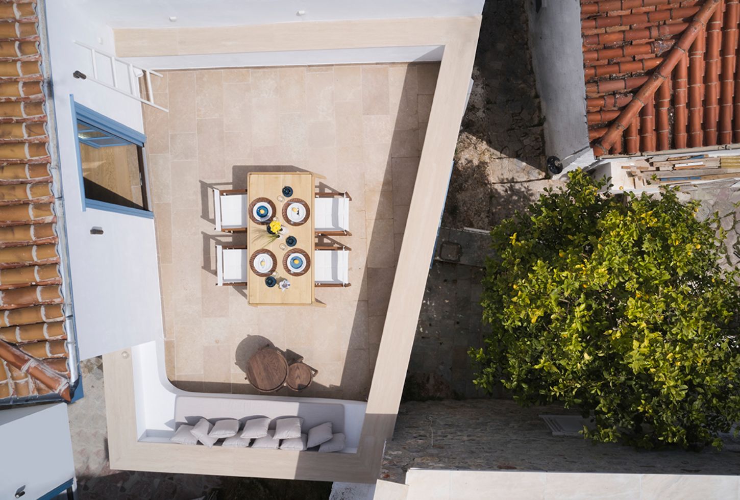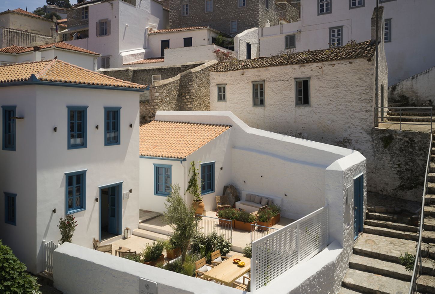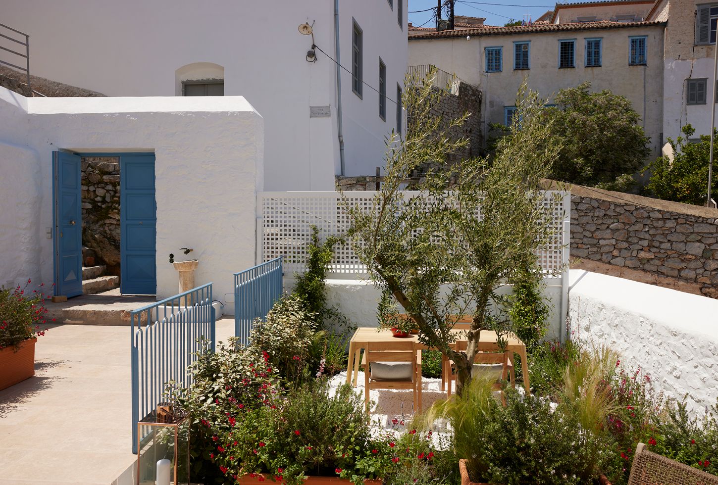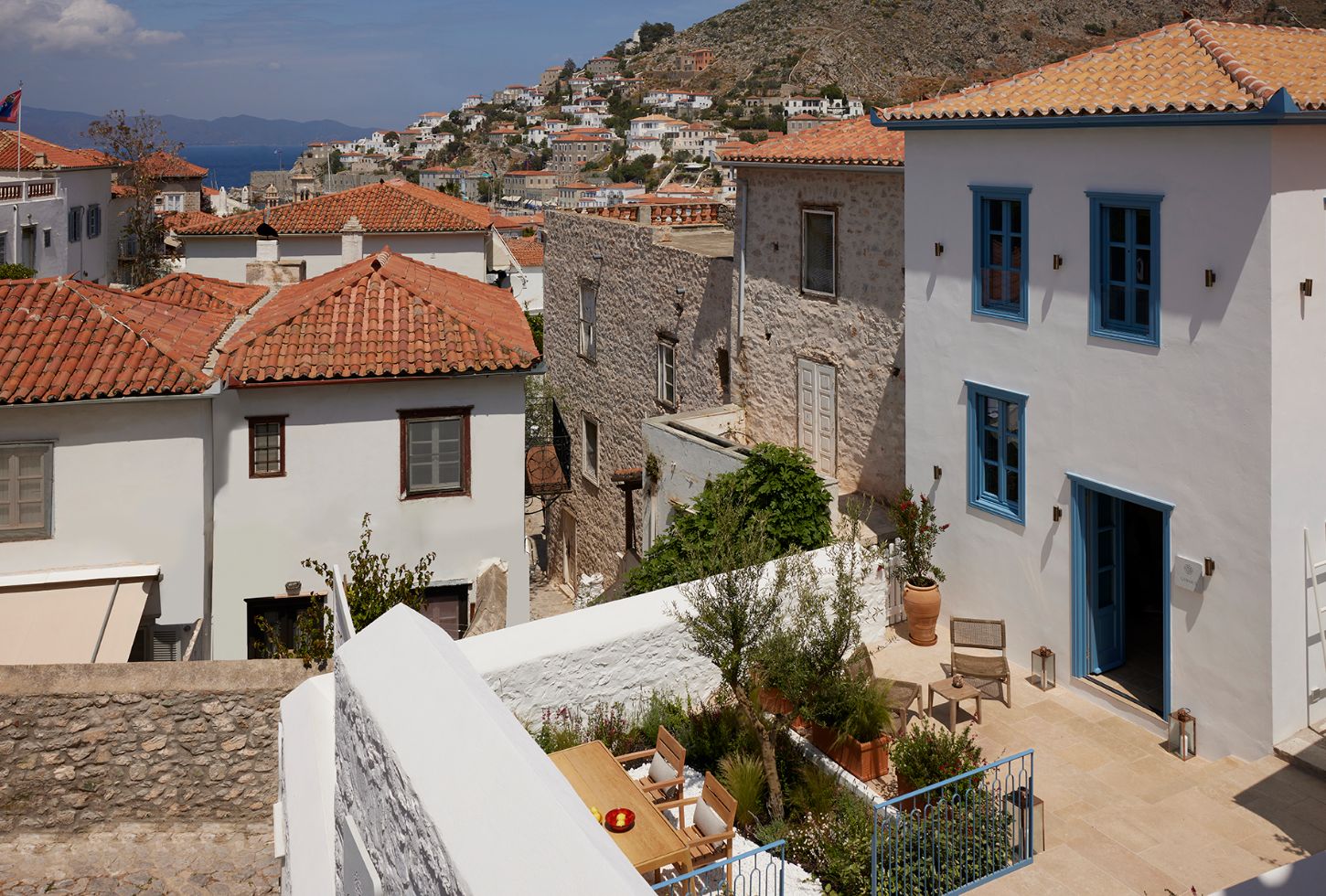Rehabilitation has been made in full respect to historical Hydra standards, under the authority of the Byzantine archeology commission. The selection of noble materials such as Venetian stones, red Eretria marble, oak wood for the building, the respect of the Orloff color pallet especially on the blue windows, the use of fine fabrics enhancing the life on a Greek island, create a refined environment devoted to the well-being of the guest, while paying tribute to the unique character of Hydra, an island marked by history and authenticity.
