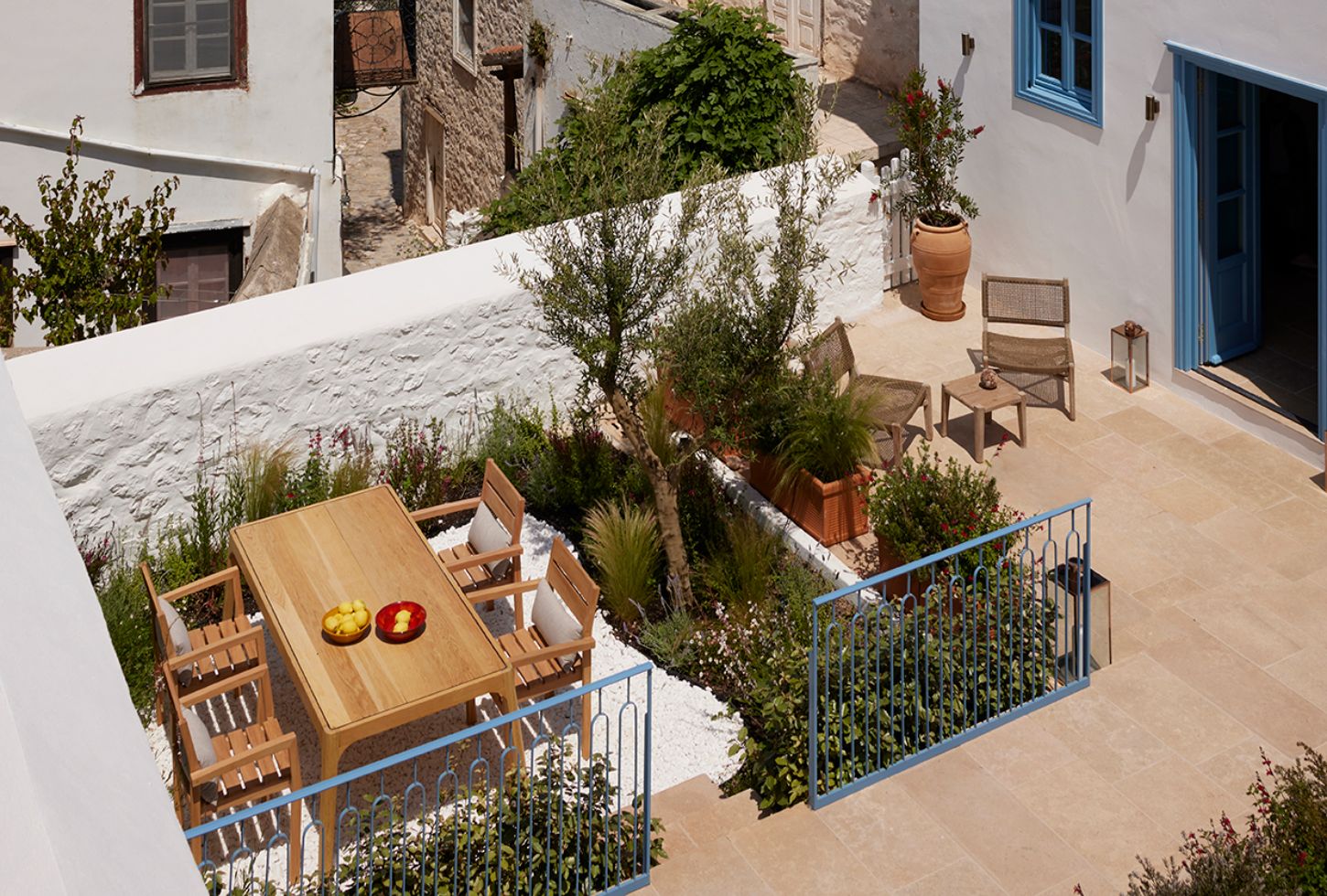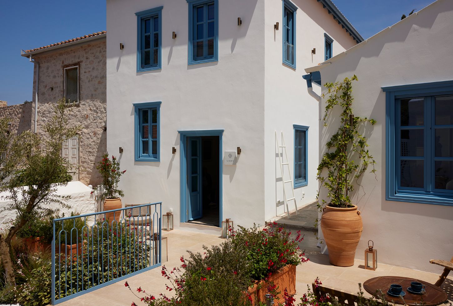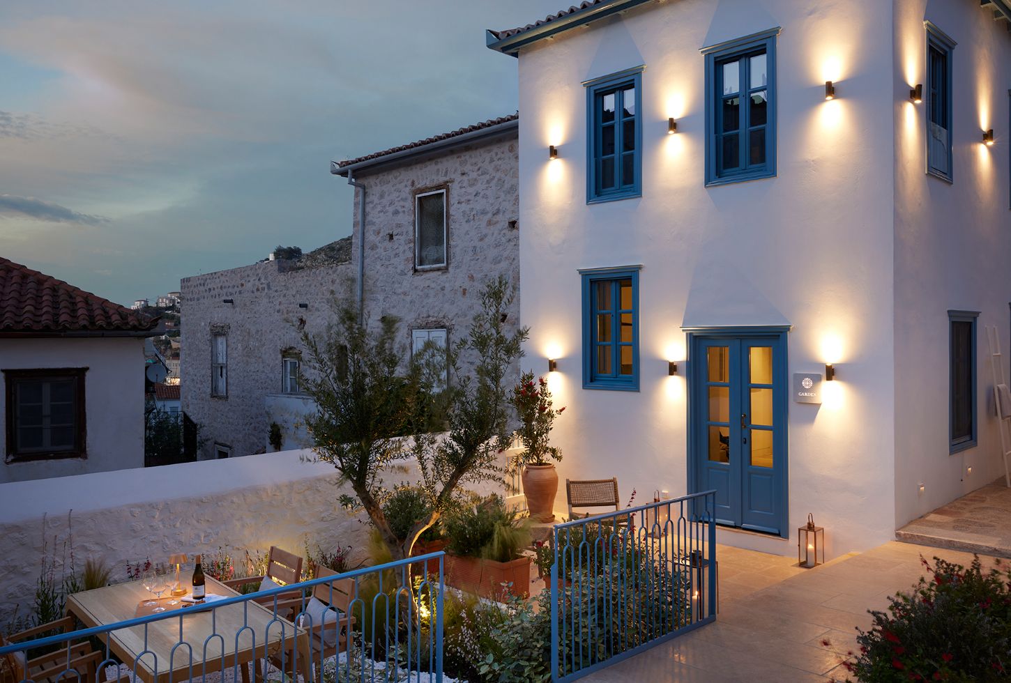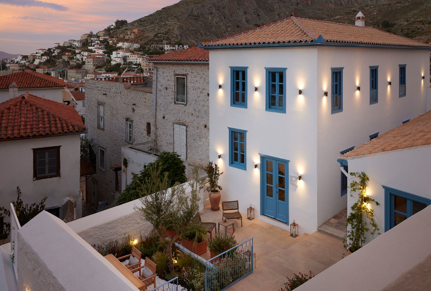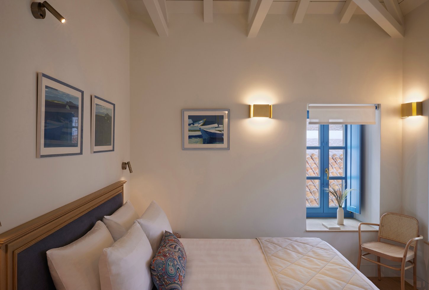 Rehabilitation has been made in full respect to historical Hydra standards, under the authority of the Byzantine archeology commission. The selection of noble materials such as Venetian stones, red Eretria marble, oak wood for the building, the respect of the Orloff color pallet especially on the blue windows, the use of fine fabrics enhancing the life on a Greek island, create a refined environment devoted to the well-being of the guest, while paying tribute to the unique character of Hydra, an island marked by history and authenticity.
