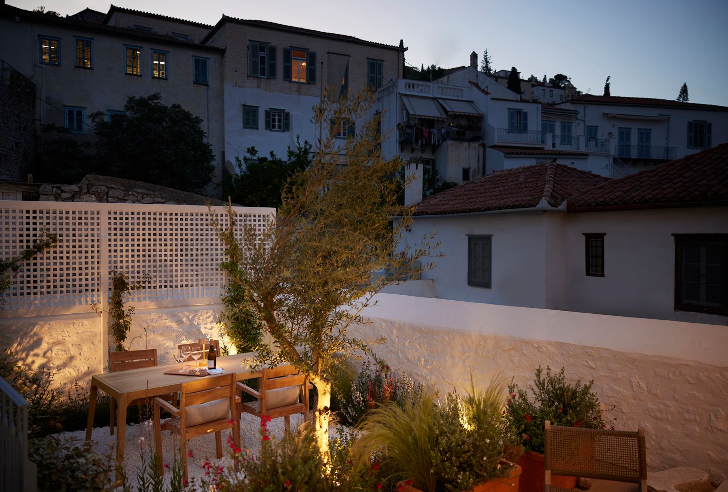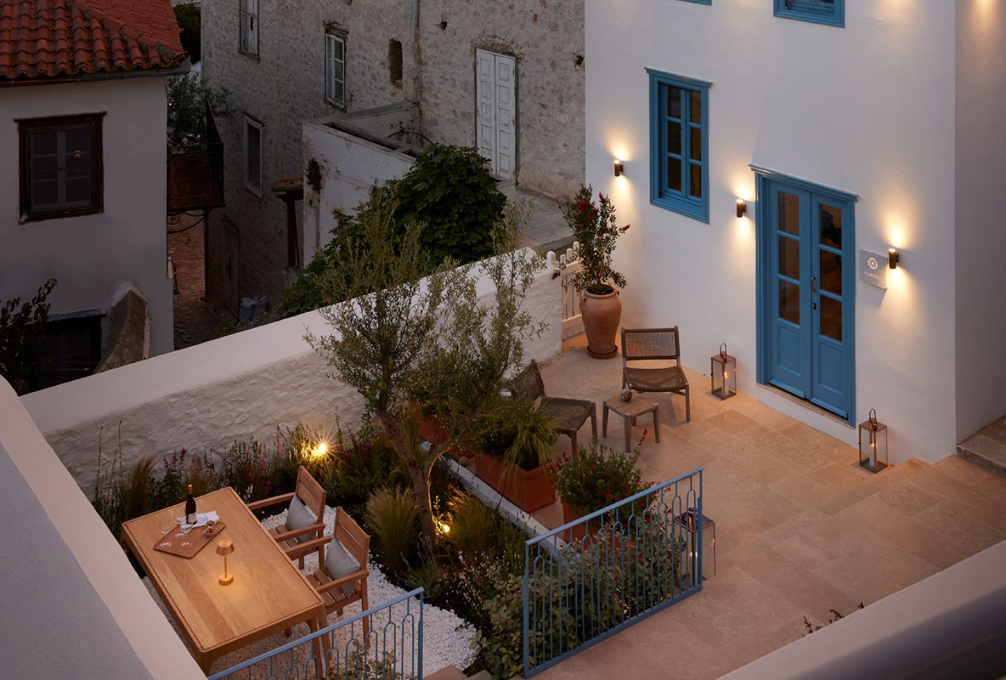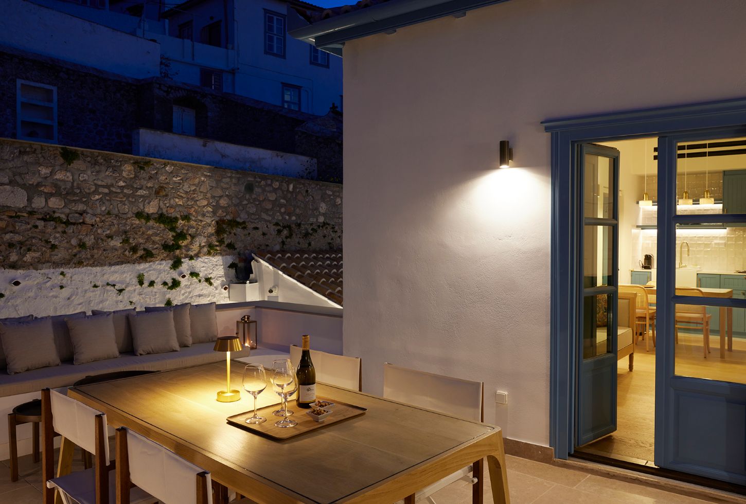 With only 3 suites,  of a surface of about 45 sq.m., plus a smaller Cozy Double Room of 20sqm, facing a central courtyard, with private patios, one large balcony on the upper floor, and most with a fully equipped kitchen, the artistically decorated Legacy Suites can be occupied individually or rented as a whole by extended families desiring to spend holidays together on Hydra. Conviviality and togetherness radiate in the traditional courtyard where under the olive tree a large table welcomes summer gatherings, after a drink served in the adjacent outdoor living area.