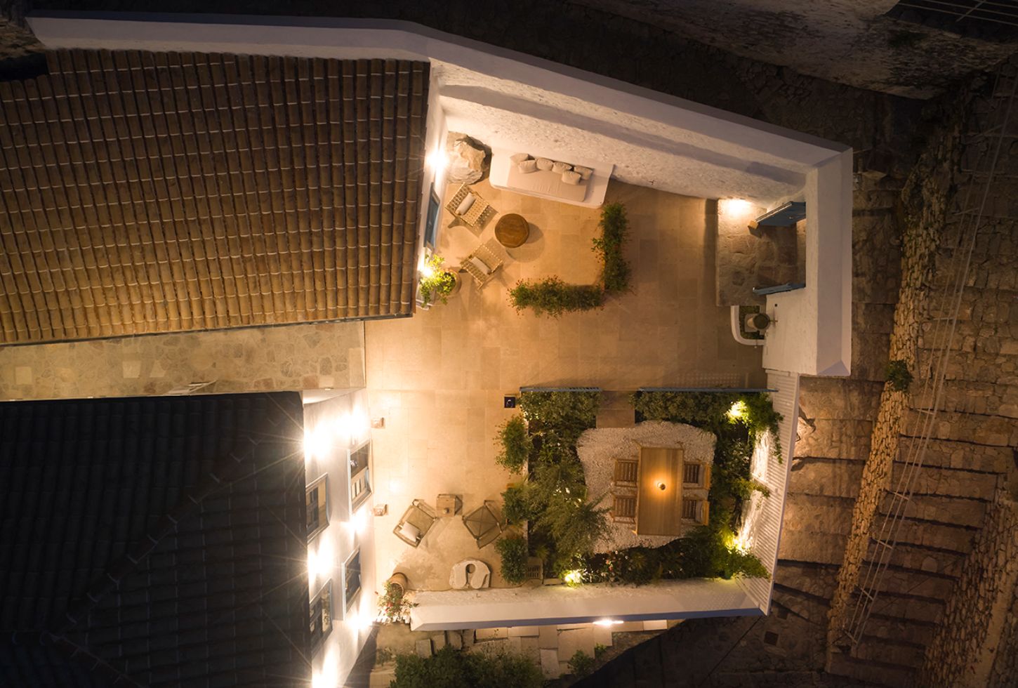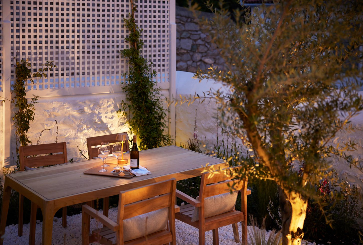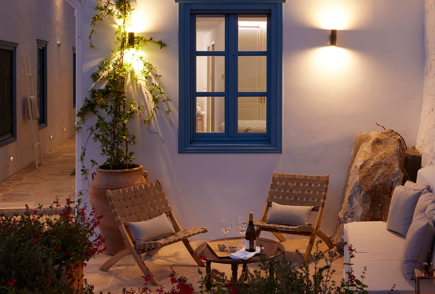 With only 3 suites,  of a surface of about 45 sq.m., plus a smaller Cozy Double Room of 20sqm, facing a central courtyard, with private patios, one large balcony on the upper floor, and most with a fully equipped kitchen, the artistically decorated Legacy Suites can be occupied individually or rented as a whole by extended families desiring to spend holidays together on Hydra. Conviviality and togetherness radiate in the traditional courtyard where under the olive tree a large table welcomes summer gatherings, after a drink served in the adjacent outdoor living area.